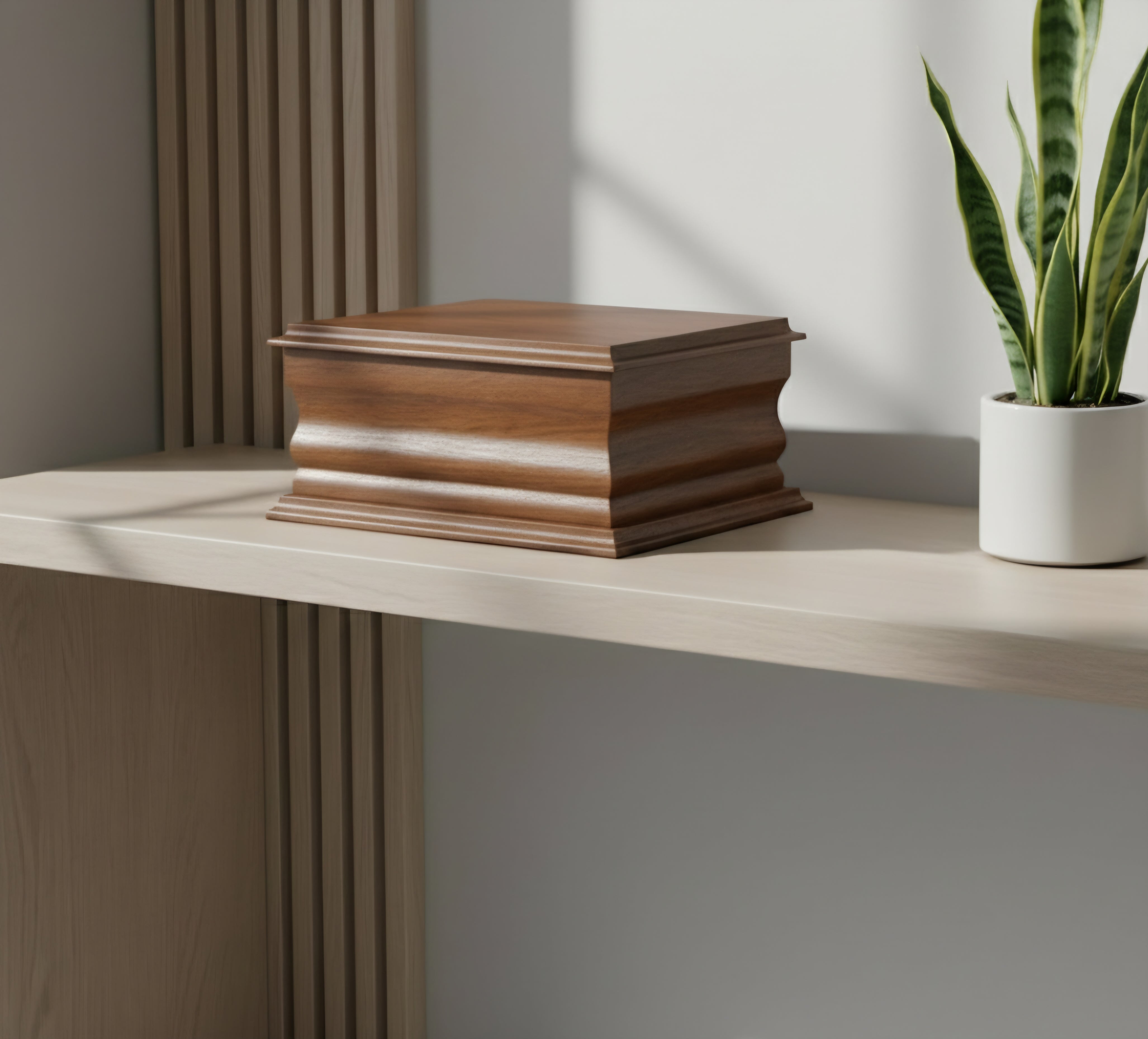 Sustainably sourced and masterfully crafted from solid Mahogany, with a beautiful glossy finish. Ashes can be stored safely within the urn inside large sealable bag and 100% cotton pull-string bag provided.