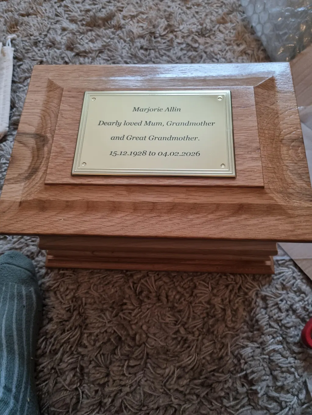 I'm so happy with this casket. Its beautiful quality and the finish is lovely. The brass plaque finishes it off, just perfect.
